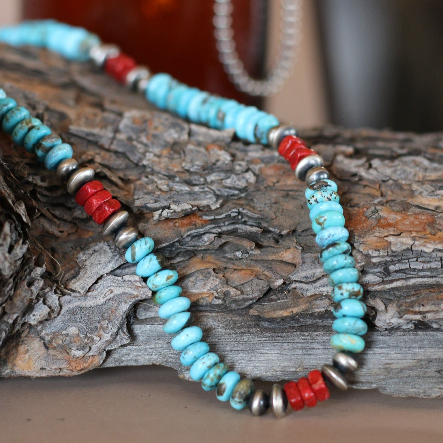 This vibrant strand features genuine Kingman turquoise, red Mediterranean coral, and hand-strung sterling silver Navajo pearls — a bold, beautifully balanced piece blending color and tradition.