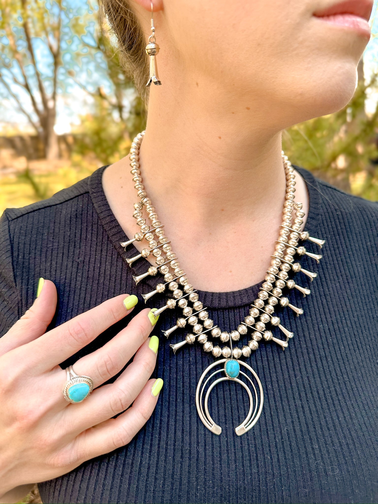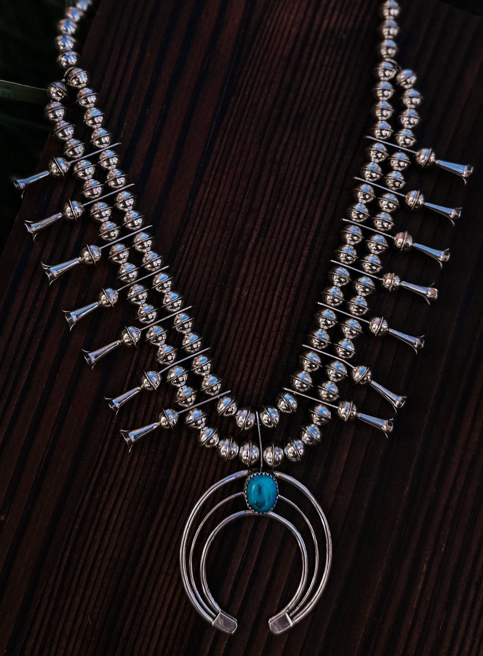 The necklace features hand-formed beads, classic squash blossom elements, and a triple-bar naja pendant set with natural turquoise. It's a statement of culture, craft, and heritage — timeless in both style and meaning.