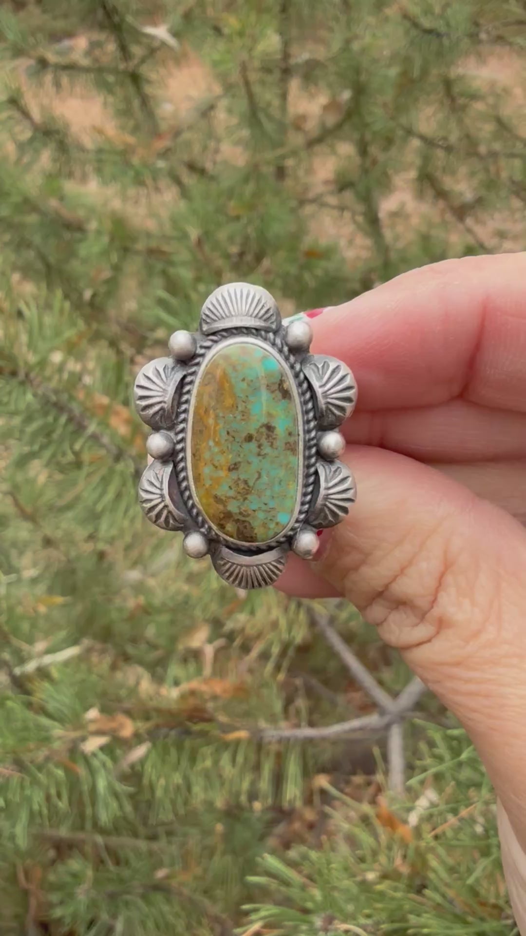 Handcrafted by E. Piaso, a Navajo silversmith known for bold turquoise and traditional stampwork, this sterling silver ring is a true statement piece. The natural turquoise stone shows beautiful matrix and earthy desert tones, framed by classic Navajo silverwork.