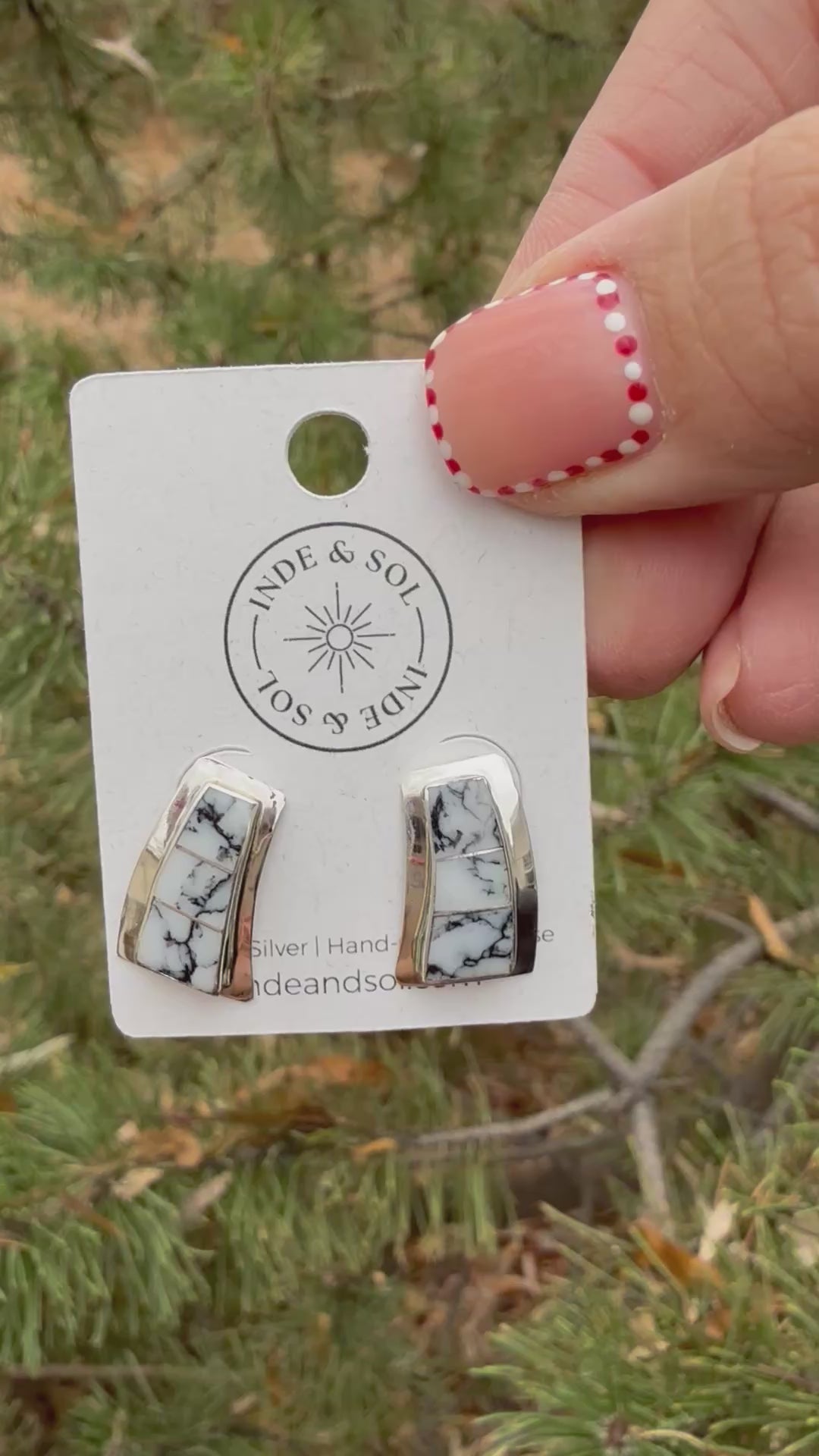 Beautiful handcrafted White Buffalo inlay earrings featuring curved sterling-silver settings and bold black-and-white stone patterning. These were sourced through Art Quintana Indian Trading, a long-time trusted Native arts dealer based in Albuquerque.