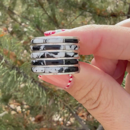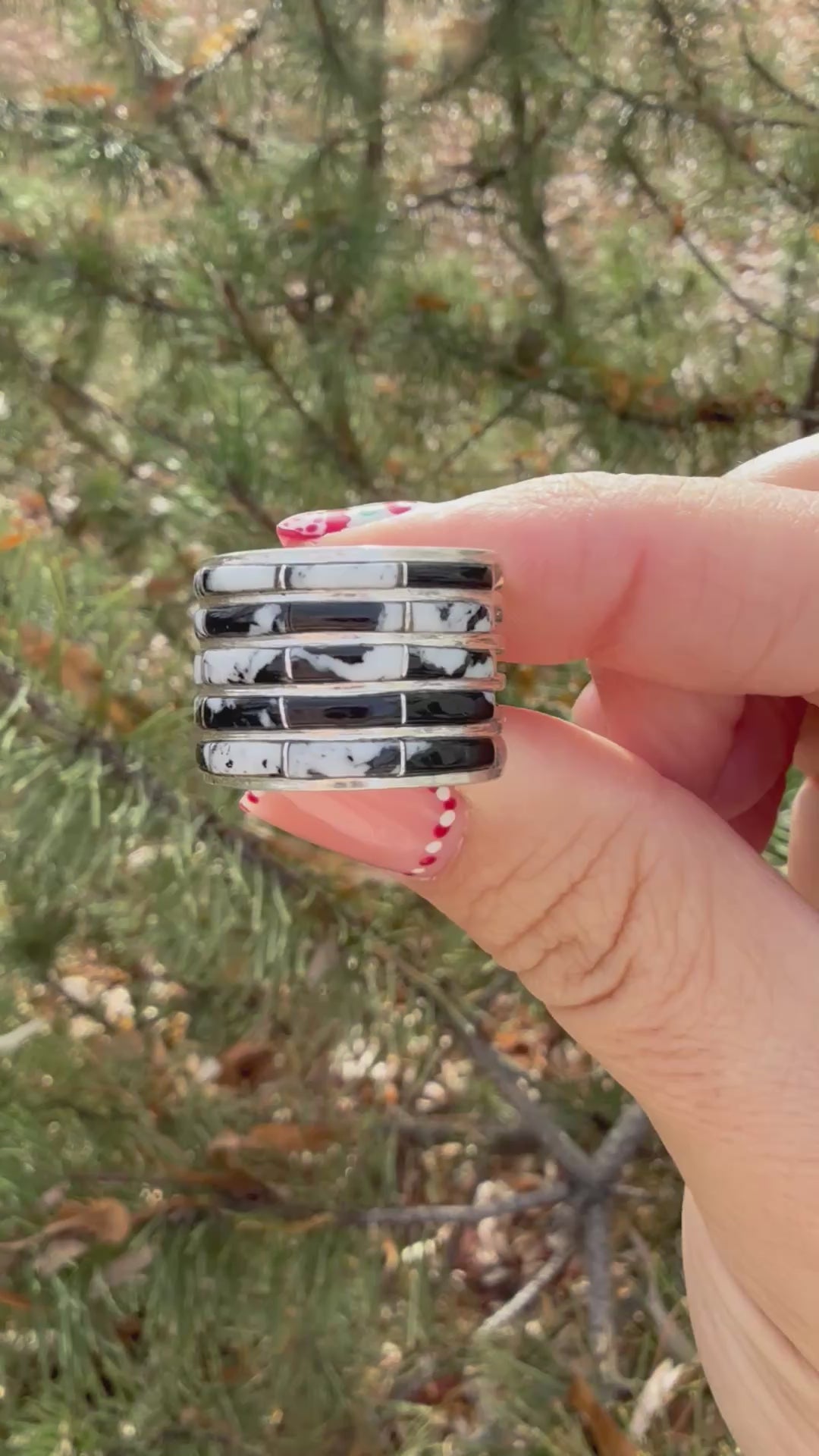 A stunning handcrafted inlay band by Navajo artist Jamie Johnson, featuring stacked rows of genuine White Buffalo set in sterling silver.