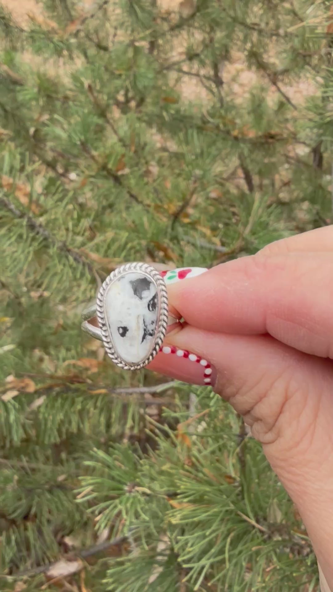 Handcrafted by Navajo silversmith Burt K. Francisco, this sterling silver ring features a bold oval White Buffalo stone with beautiful natural black-and-white matrix. Set in a classic rope-edge bezel with a split shank, this piece showcases traditional Navajo craftsmanship and timeless style.